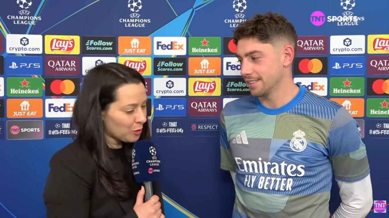 欧冠1/8决赛首回合,皇马主场3-0战胜曼城,巴尔韦德上演帽子戏法,赛后他接受了TNT体育巴西频道的采访。